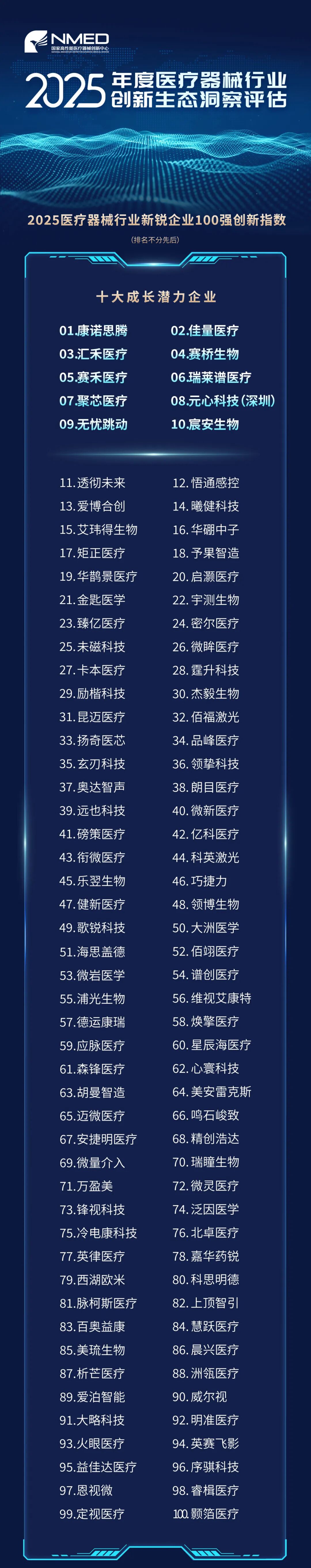 当前,一年一度的“医疗器械行业新锐企业100强创新指数”已逐步成为衡量中国医疗器械产业年度创新活力与未来竞争力的价值标尺,识别并聚集了代表产业未来、具成长性的百支创新主体。