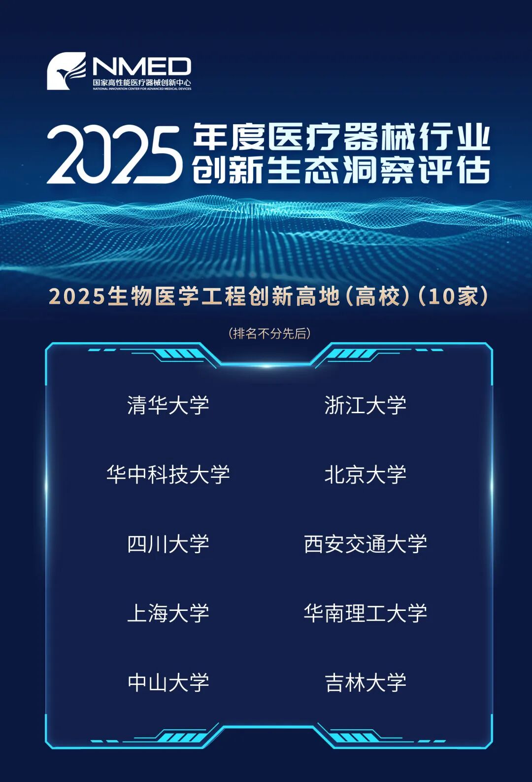 “2025生物医学工程创新高地(高校)”评估结果中,西安交通大学、上海大学、华南理工大学、吉林大学4所高校首次获评,共同构成了支撑产业创新与未来发展的多元化、体系化研发策源地。