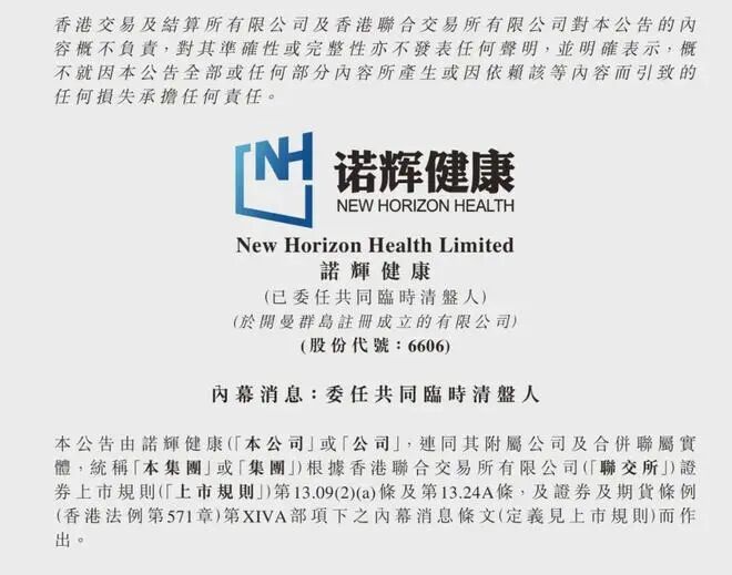 2025年8月8日,诺辉健康(06606.HK)发布公告宣布,开曼大法院已委任三家机构的专业人士为公司的共同临时清盘人。 董事会权力被全面暂停,公司资产及事务管理正式移交给清盘人。