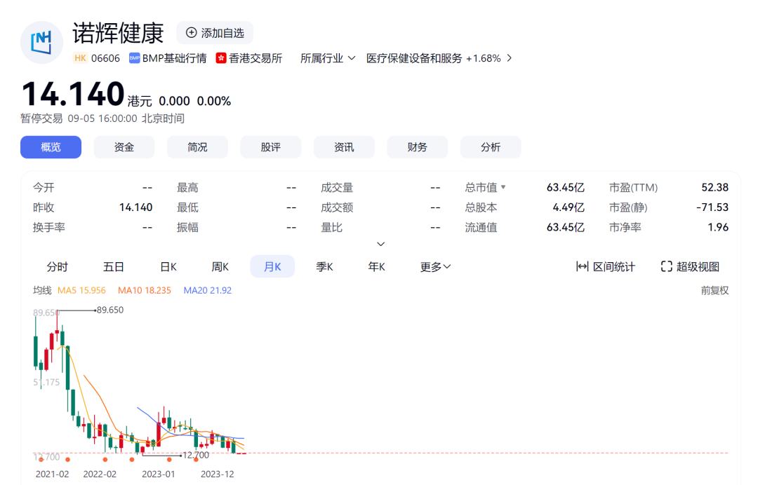 随即,诺辉健康被港交所强制停牌,股价定格在14.14港元。当时无人料到,这竟是公司在资本市场的最后身影。