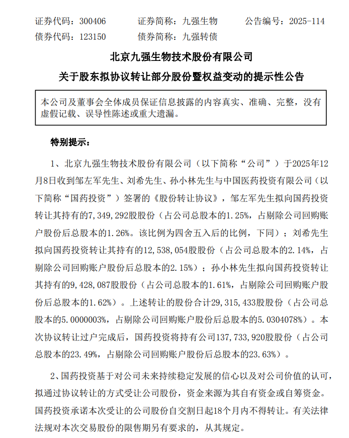 九强生物(300406)12月9日晚间公告,公司股东邹左军、刘希、孙小林与中国医药投资有限公司(以下简称“国药投资”)签署《股份转让协议》,前者拟通过协议转让方式向国药投资合计转让2931.54万股股份,占九强生物总股本的5%,交易总价款达4.01亿元,每股转让价格为13.68元。该公司今日收盘价为每股13.49元。