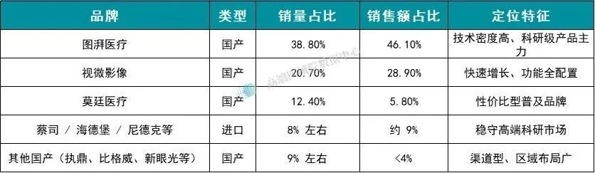 其中,约21.5%的项目涉及OCTA(光学相干血流成像)功能,显示出OCT应用正在从“结构必配”迈向“血流常配”的阶段。值得注意的是,虽然国产品牌的市场份额已超过九成,但市场并非单一的“头部独占”格局。