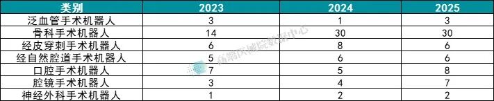 • 骨科手术机器人扩容明显:从2023 年 14 件增至 2024 年30 件,并在 2025 年保持该规模,成为突破最突出的细分品类;