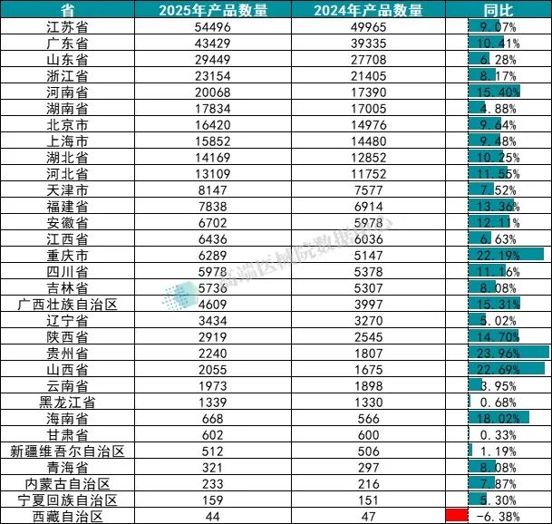 贵州省(同比23.96%)、山西省(23.69%)、重庆市(同比22.19%)等地区的产品数量增速居前,区域扩容节奏差异显著。