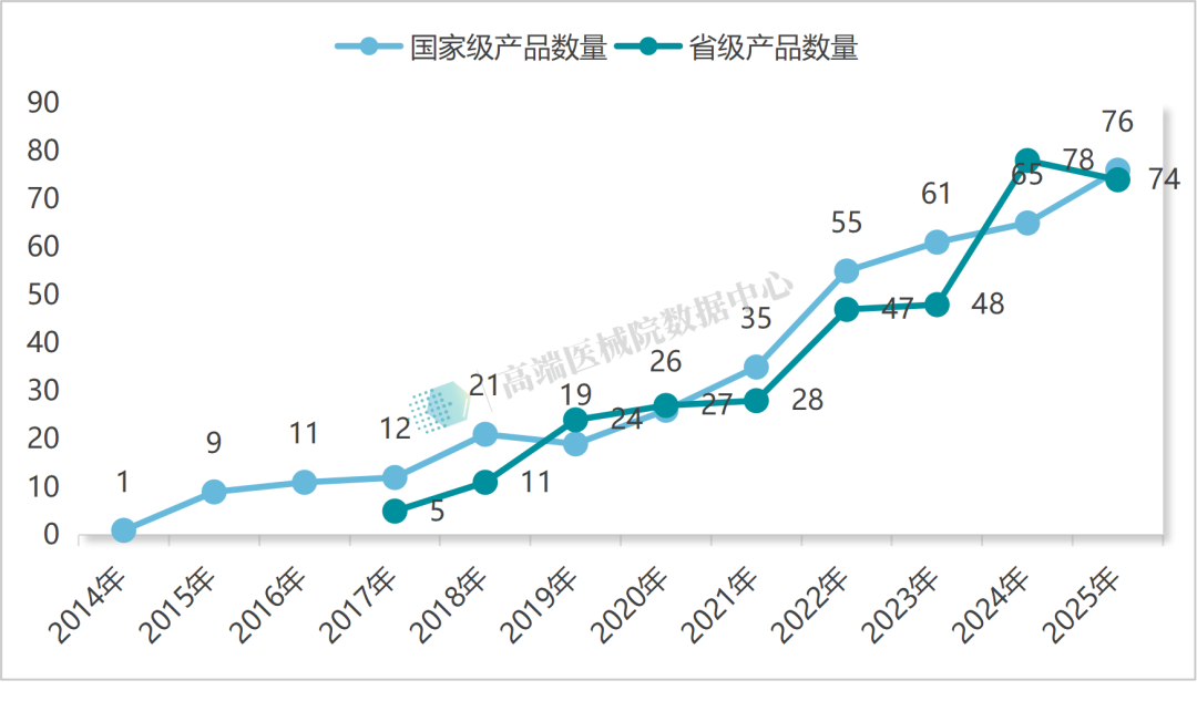 从长期趋势看,创新医疗器械的审批效率与落地速度持续提升:其中国家级创新获批产品数量增长最为突出,从2014 年的 1 件稳步增至 2025 年的 76 件,11 年间实现量级跨越,充分反映创新产品从研发到商业化的落地周期不断缩短,行业创新活力的释放节奏明显加快。