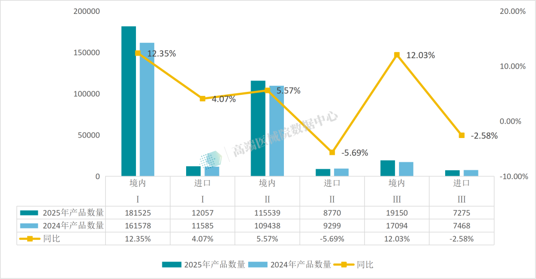 从境内与进口产品的同比表现来看,2025 年呈现明显分化:进口端中,Ⅱ 类、Ⅲ 类医疗器械产品数量同比分别下跌 5.69%、2.58%;而境内端增长动能强劲,其中境内 Ⅰ 类、Ⅲ 类医疗器械的同比增幅领跑,分别达到 12.35%、12.03%。