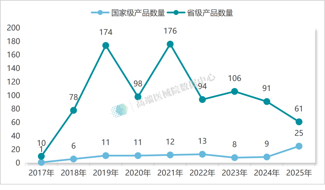 省级:创新获批74 件,与近年水平基本衔接;但优先获批 61 件,较历史峰值(2021 年 176 件)明显回落,且 2019-2025 年省级优先获批数量整体呈无规律波动态势,这一现象或与省级优先审批的评判标准逐步趋严、对产品临床价值与创新度的审核维度细化相关。