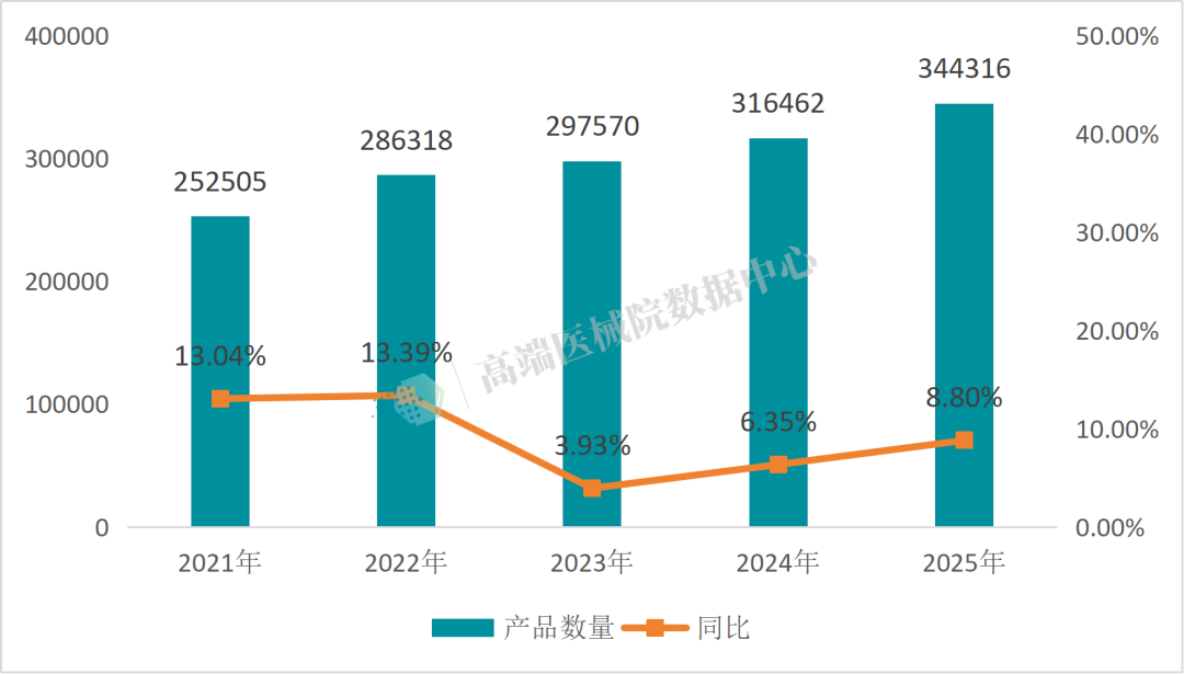2021-2025 年,产品数量从 252505 件增至 344316 件,连续五年扩容。增速呈阶段性波动:2021-2022 年保持 13%+ 高增,2023 年回落至 3.93%,2024-2025 年回升至 6.35%、8.80%,回归稳健增长。