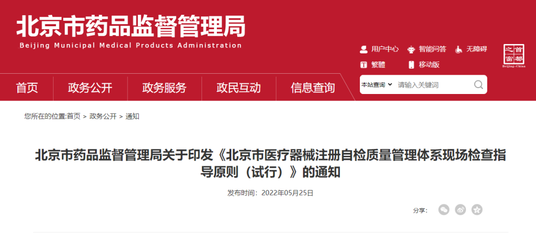 为规范医疗器械注册自检质量管理体系核查工作,强化注册审评与体系核查环节的衔接,保证体系核查工作质量,根据《医疗器械监督管理条例》(国务院令第739号)、《医疗器械注册与备案管理办法》(国家市场监督管理总局令第47号)、《体外诊断试剂注册与备案管理办法》(国家市场监督管理总局令第48号)、《北京市药品监督管理局关于印发〈北京市医疗器械注册质量管理体系核查工作程序〉的通知》(京药监发〔2022〕148号)等相关规定,结合我市实际,北京市药品监督管理局组织制定了《北京市医疗器械注册自检质量管理体系现场检查指导原则(试行)》,现予印发,自发布之日起施行。