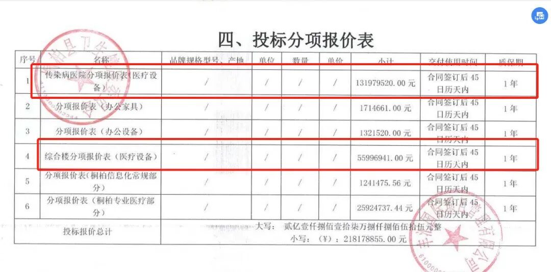 根据投标分项报价表,该项目分为6个子项目,其中,医疗设备采购总金额约为1.88亿元,然而具体设备并未公布在中标公告中。