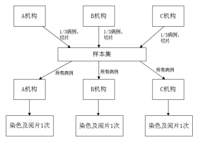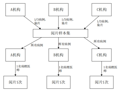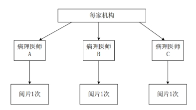 每家临床试验机构选择3名不同资历的病理医师参与临床试验,临床试验过程中由每名病理医师对该机构入组的所有病理切片进行判读,所有病理医师的阅片结果组成分析数据集。机构内不同病理医师阅片一致性试验设计如图3。