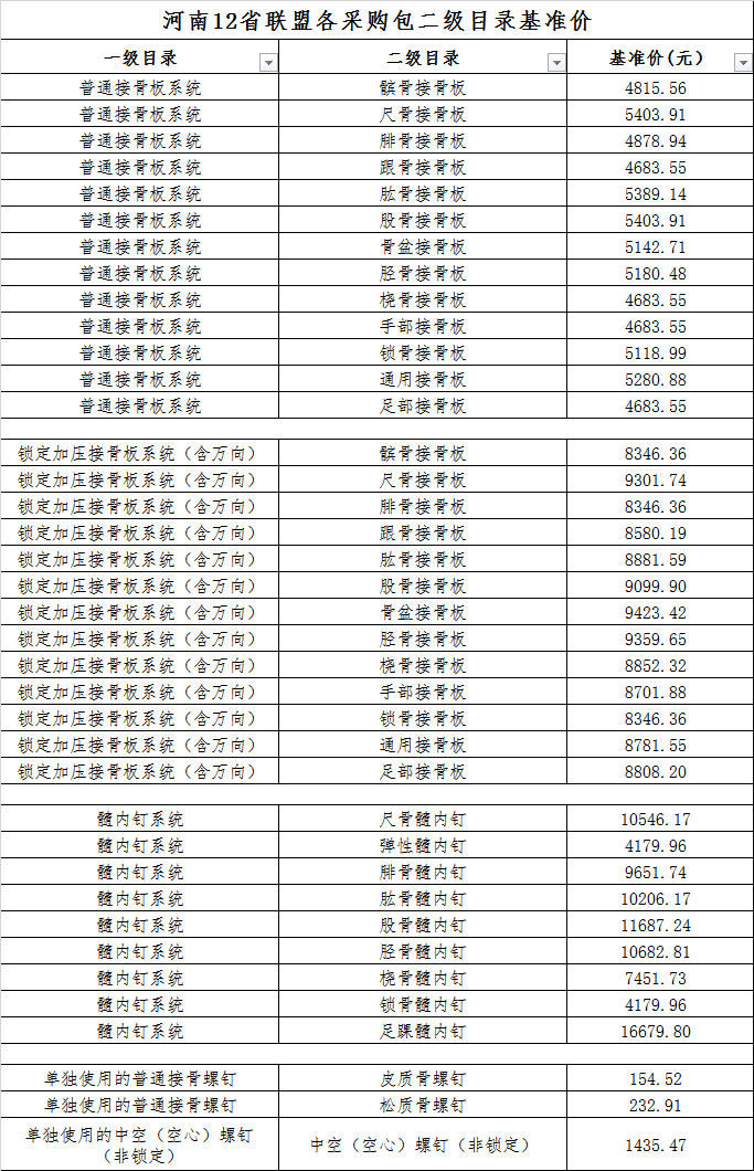 本次集中带量采购品种为接骨板及配套螺钉、髓内钉及配件、中空(空心)螺钉等骨科创伤类医用耗材。接骨板与配套螺钉组成系统,髓内钉与其配件组成系统,分为普通接骨板系统、锁定加压接骨板系统(含万向)和髓内钉系统三个采购包和可单独使用的螺钉目录(具体目录见附件)。