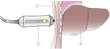 由于肝脏组织结构对检测结果影响较大,部分产品在检测硬度之前需通过超声影像探头进行检测位置确认,用影像探头对肝脏部位进行超声影像扫查,避开大血管、囊肿、实体病变,选择肝脏组织均匀、无大的管道结构的部位进行检测,提高检测结果的准确性和一致性。