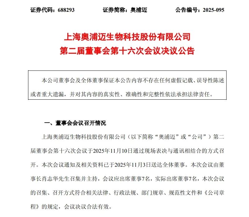 2025年11月11日,上海奥浦迈生物科技股份有限公司(688293)更新第二届董事会第十六次会议决议公告。
