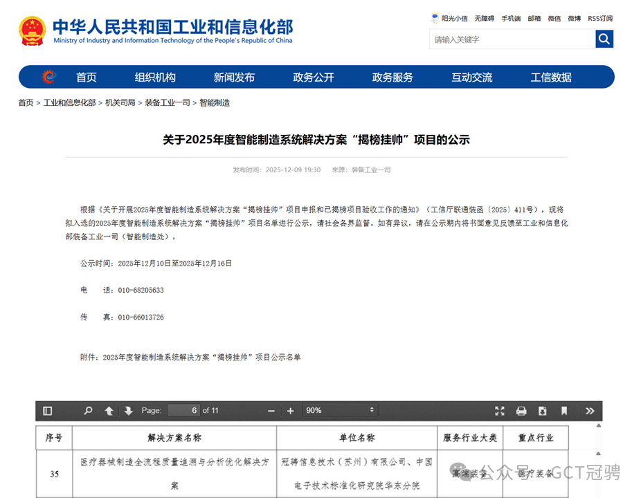 冠骋信息技术(苏州)有限公司新一代可组装式智能GMP系统MedPro NEXT以“医疗器械制造全流程质量追溯与分析优化解决方案”为题成功揭榜,成为医疗装备领域唯一入选基于GMP的数智化系统。此次“揭榜挂帅”任务由冠骋信息技术(苏州)有限公司、中国电子技术标准化研究院华东分院联合申报。