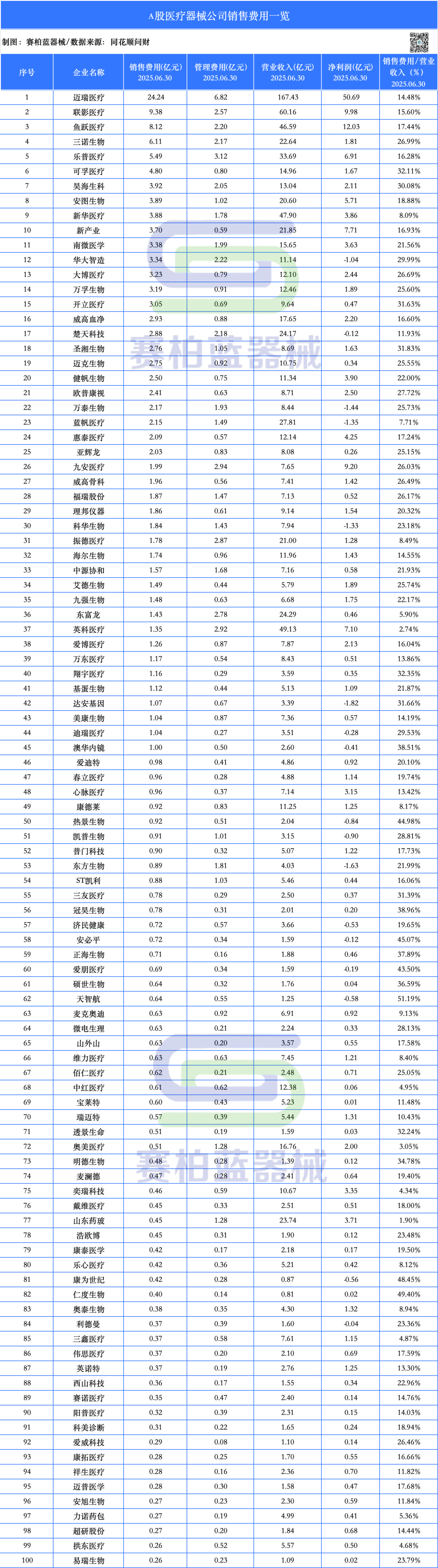 同花顺问财数据显示,截至2025年6月30日,A股医疗器械上市企业销售费用排名前100名如下: