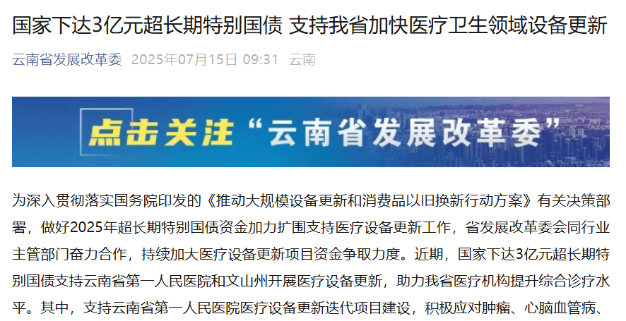 云南省发展改革委7月公布,国家下达3亿元超长期特别国债支持云南省第一人民医院和文山州开展医疗设备更新。其中,支持云南省第一人民医院医疗设备更新迭代项目建设,积极应对肿瘤、心脑血管病、代谢性疾病等严重危害人民群众健康的重大疾病,推动医院不断提升疑难复杂疾病诊疗、高层次医学人才培养、临床科研创新与应用转化水平;支持文山州县域医共体设备更新项目建设,加快县级医院医疗设备提质升级,加强县、乡、村医疗服务协同联动。