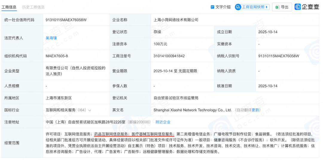 今日(10月14日),抖音有限公司通过间接全资方式在上海新设上海小荷网络技术有限公司,法定代表人吴海锋,经营范围包括药品互联网信息服务、医疗器械互联网信息服务及第二类增值电信业务等。