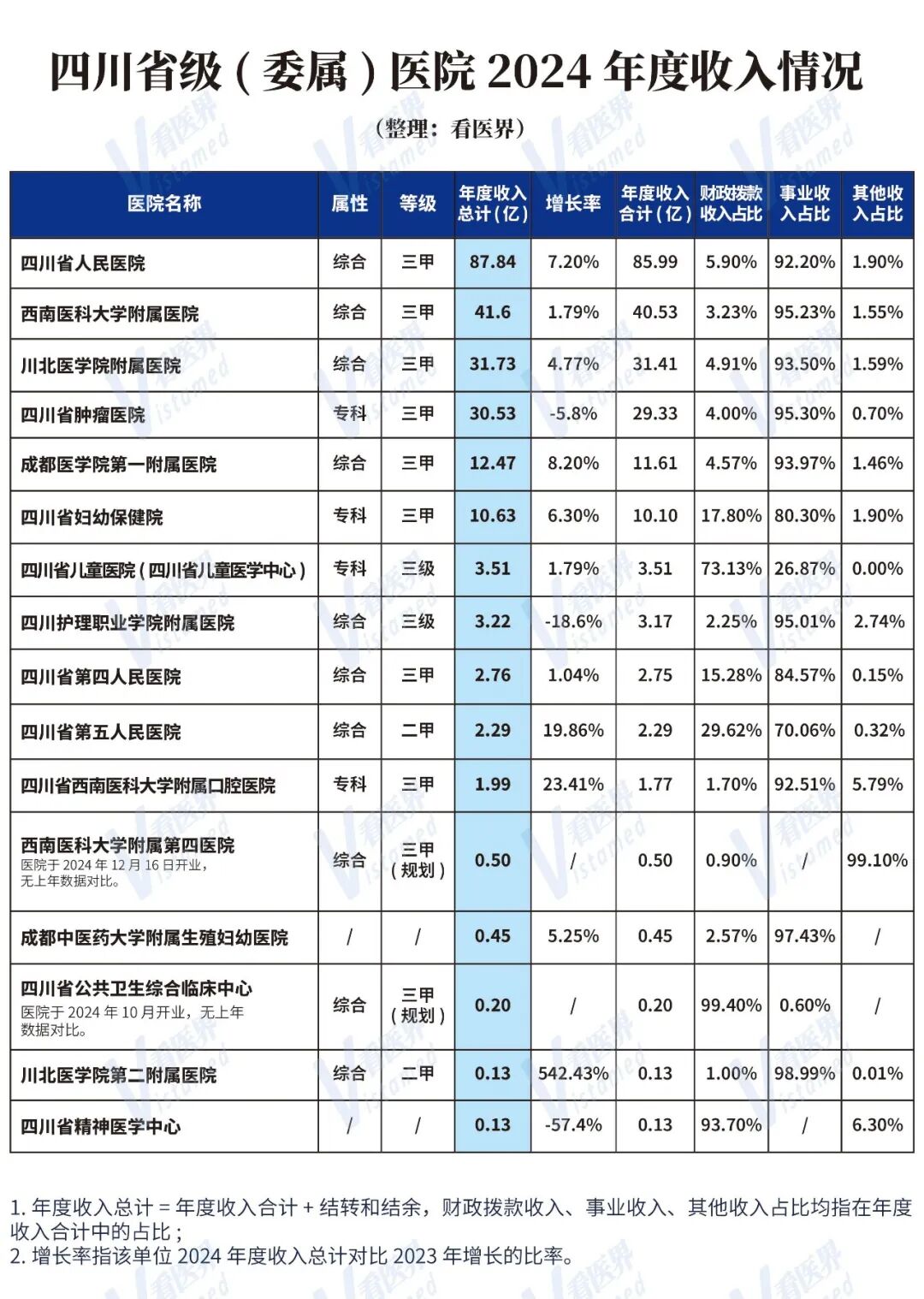 此外,从这个收入表看,2024年,四川新增了两家省卫健委直属医院,分别为2024年12月16日开业的西南医科大学附属第四医院;2024年10月开业的四川省公共卫生综合临床中心,两家医院均为三级甲等综合医院的规划。
