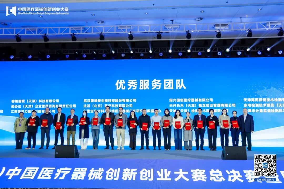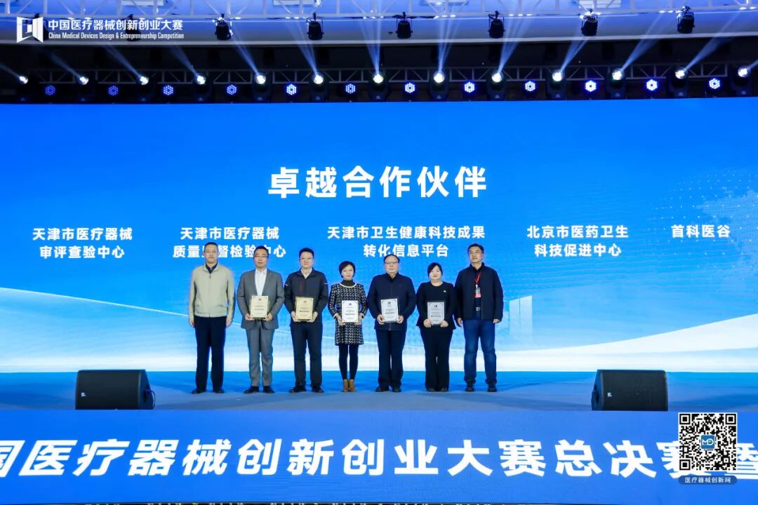颁奖环节进行第三项,中国科技发展基金会副秘书长李洋与国家医疗器械产业技术创新联盟秘书长王临,为大赛卓越合作伙伴颁奖。获奖单位包括天津市医疗器械审评查验中心、天津市医疗器械质量监督检验中心、天津市卫生健康科技成果转化信息平台、北京市医药卫生科技促进中心、首科医谷,这些机构为赛事组织与成果转化提供了关键支持。