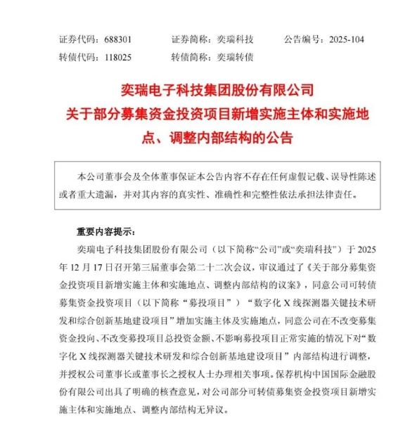 国产影像龙头奕瑞电子科技集团股份有限公司(证券代码:688301)于20251217日公告,对“数字化X线探测器关键技术研发和综合创新基地建设项目”实施重大战略调整:新增全资子公司海宁瑞标检测实验室有限公司、奕瑞影像科技(合肥)有限公司为实施主体,新增浙江海宁、安徽合肥为实施地点,形成长三角“上海-海宁-合肥”研发-生产-测试协同网络。