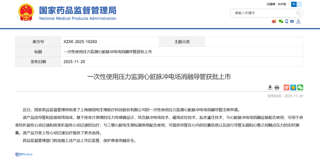 近日,国家药品监督管理局批准上海微创电生理医疗科技股份有限公司(以下简称“微创电生理”)一次性使用压力监测心脏脉冲电场消融导管注册申请。