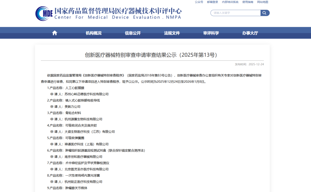 依据国家药品监督管理局《创新医疗器械特别审查程序》(国家药监局2018年第83号公告),创新医疗器械审查办公室组织有关专家对创新医疗器械特别审查申请进行审查,拟同意以下申请项目进入特别审查程序,现予以公示。公示时间为2025年12月24日至2026年1月8日。