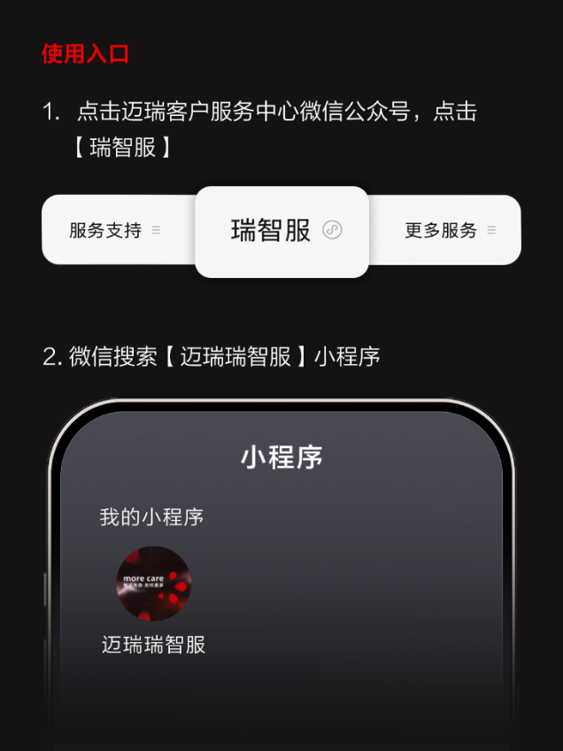 1、点击迈瑞客户服务中心微信公众号,点击【瑞智服】