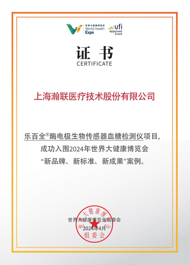 乐百全®精准血糖检测设备已获颁国家二类医疗器械注册证,实现酶电极生物传感器血糖检测方法学国内产品注册“零”的突破。乐百全®凭藉独特的产品定位、完善的功能和产品社会价值获选科技部2018年度“中国工业设计大奖”。