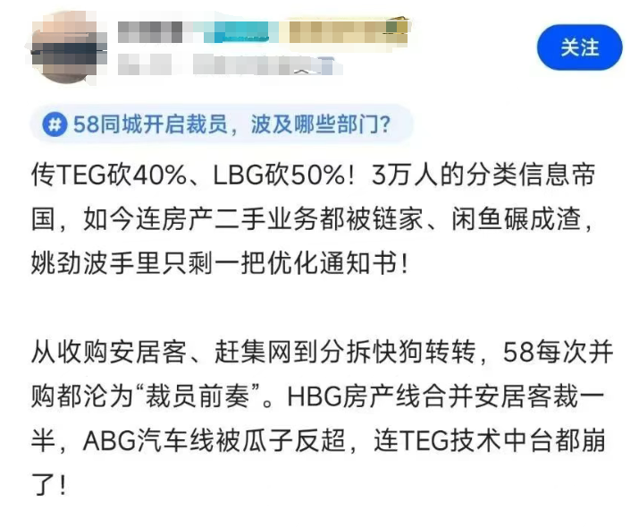 而据部分员工透露,此次裁员主要影响 TEG(技术工程事业群)、LBG(本地服务事业群)。均属于58同城核心业务,核心业务遭到如此高比例裁撤,是否意味着58同城即将开启转型?引发网友热议。